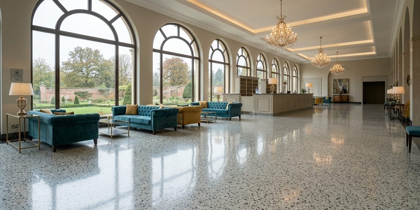 ProFloor TX utilises high-performance decorative cementitious floor topping systems, incorporating marble aggregates, natural stones, recycled materials, and/or glass aggregates, ideal for prestigious and high-traffic areas where durability and an aesthetically pleasing finish are required.