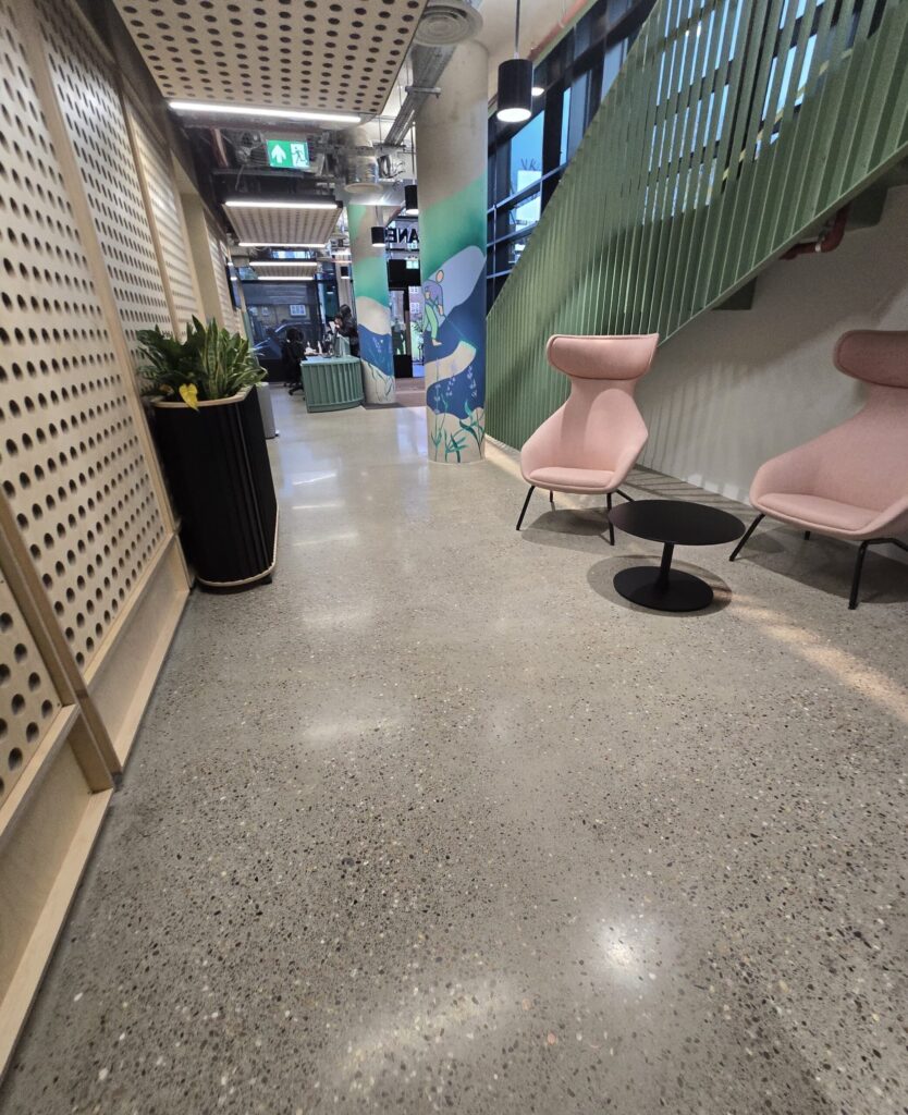 The Result is an incredibly rich, lustrous shine with beautifully exposed aggregate. The floor will actually reflect not only the lighting in the facility, but will also mirror the colours from the objects surrounding it.
